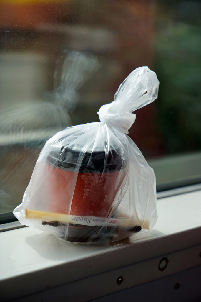 買一杯咖啡來喝!可能是怕車廂晃動~所以都會用袋子包好
